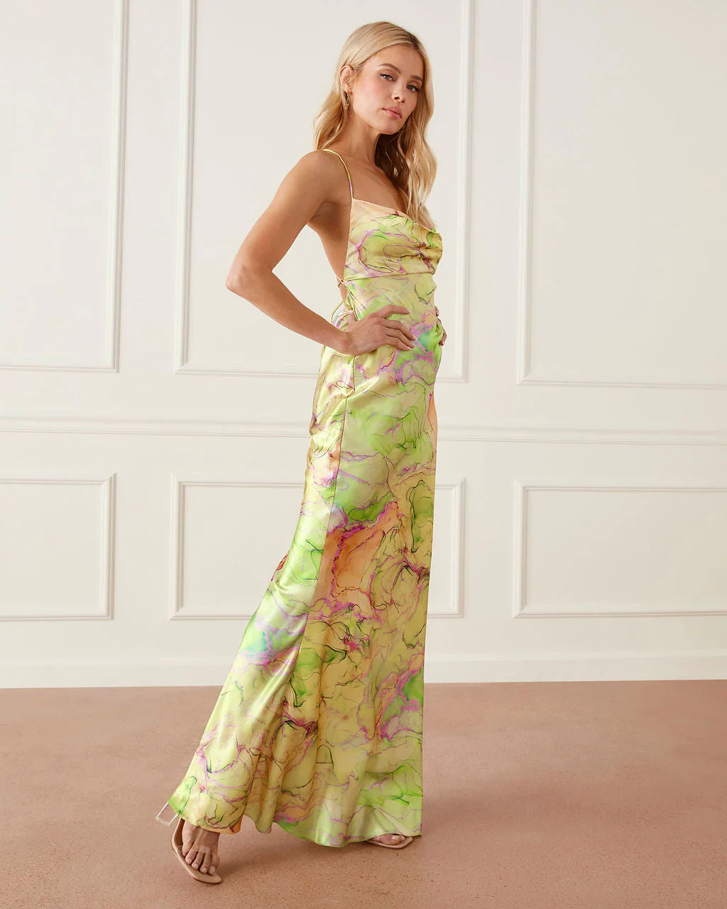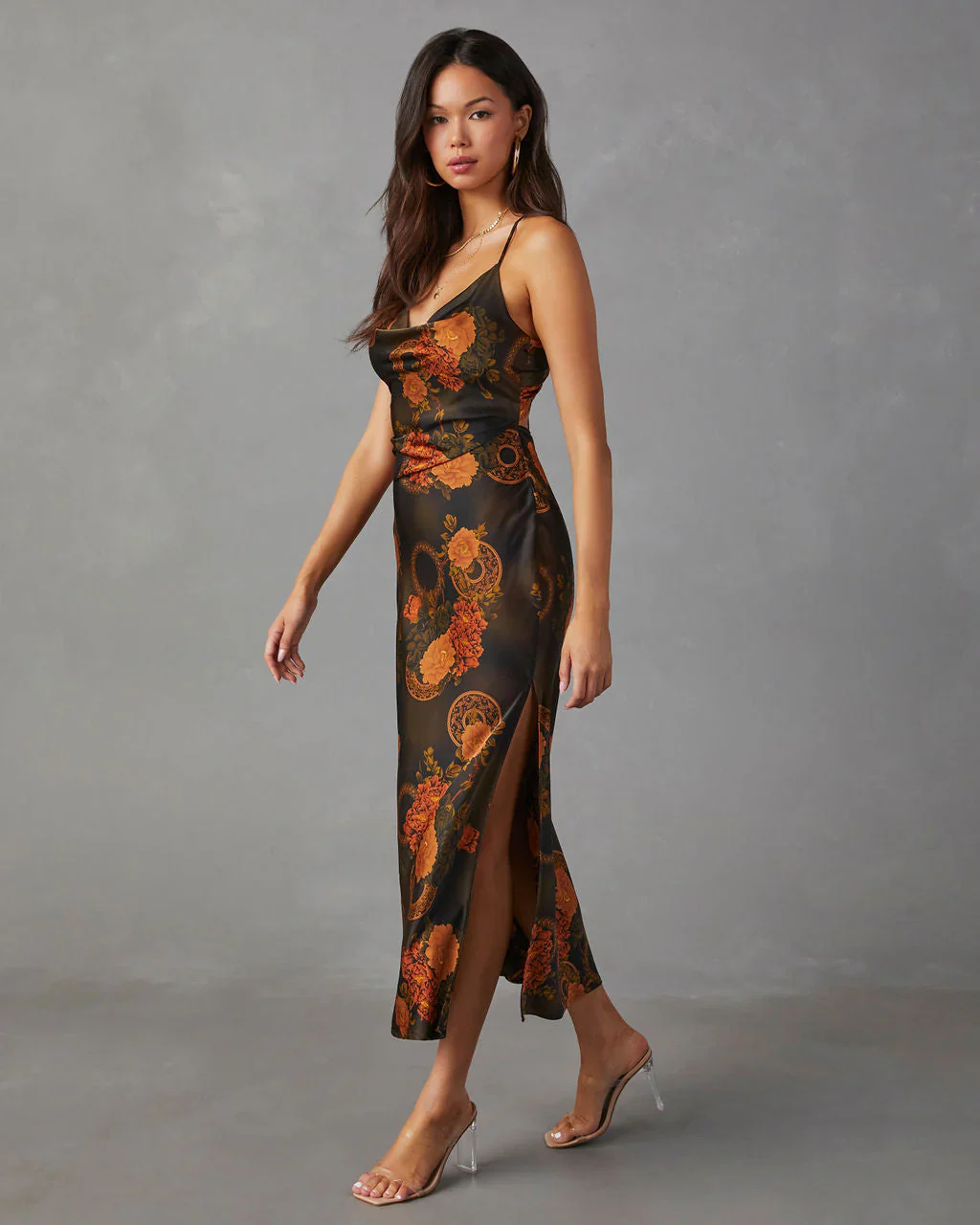Miami Nights Printed Satin Cowl Neck Maxi Dress