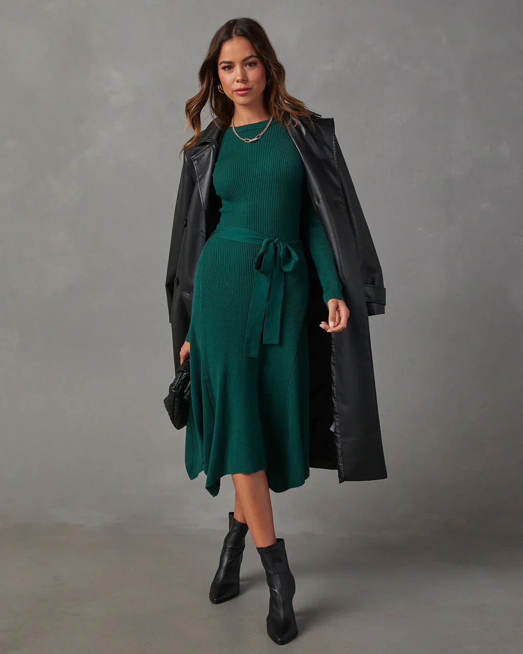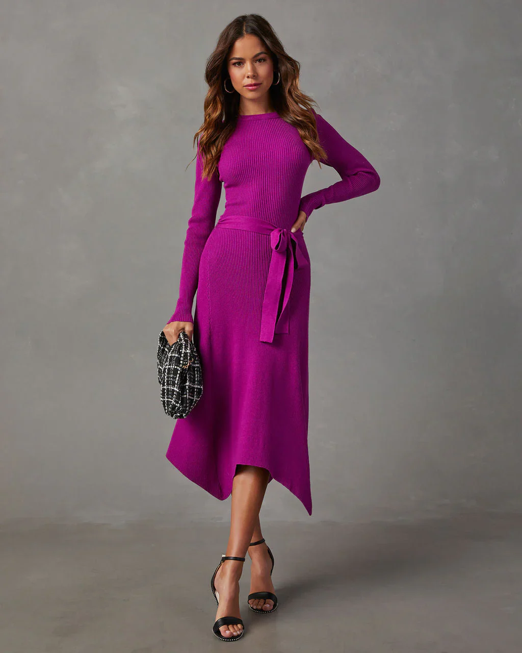 Lia Asymmetrical Hem Tie Waist Midi Sweater Dress