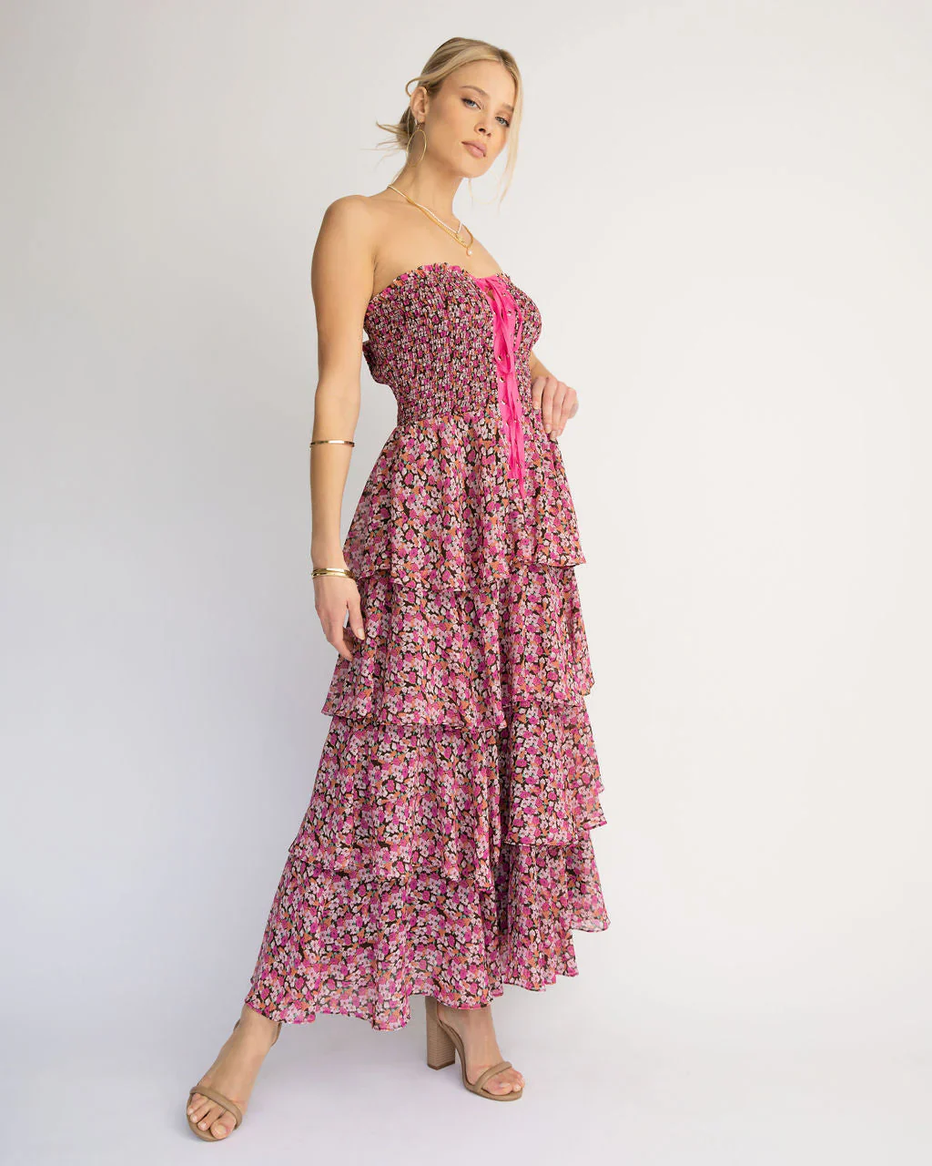 La Vida Strapless Corset Floral Tiered Midi Dress